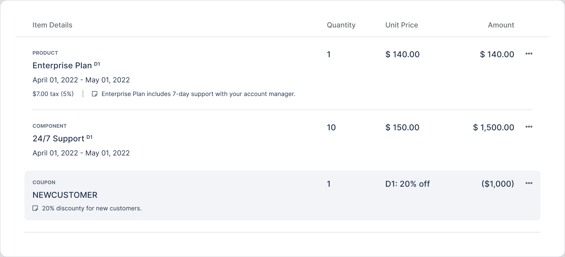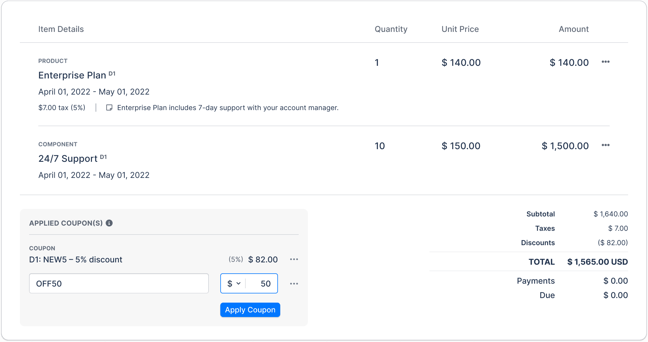 Coupons live in their own dedicated section, separate from line items. This keeps the invoice clear and the discount logic transparent.
