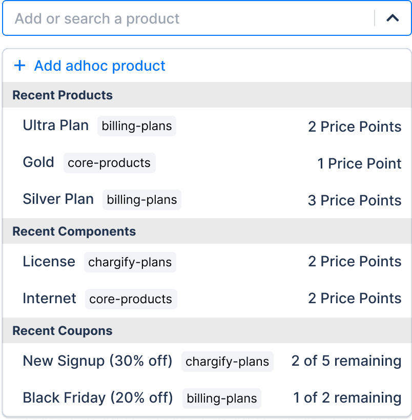 Working with PM, engineer, and UX manager, we aligned on showing only the most recently used products scoped to the user's subscription. Relevant, lightweight, and handles large catalogs gracefully.