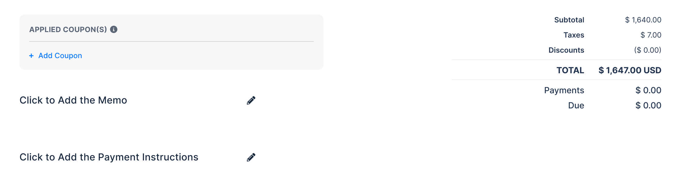 A simple "Add Coupon" link sits below the line items—unobtrusive until needed.
