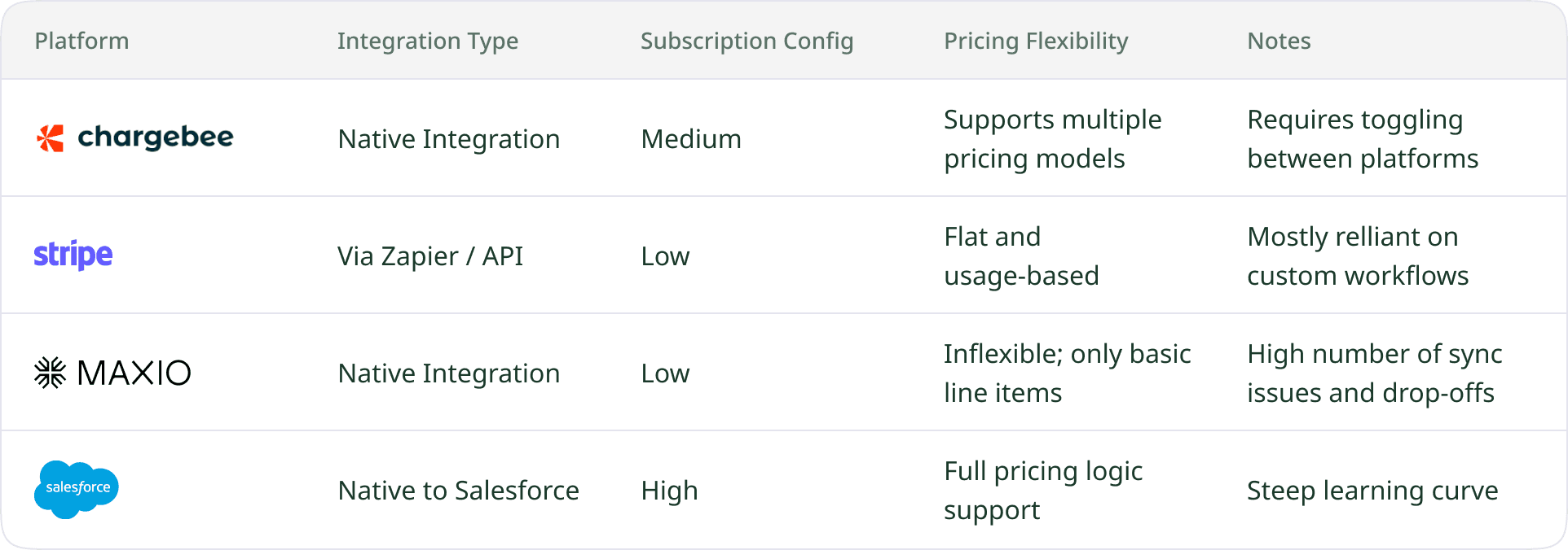 To strengthen our strategic direction, we analyzed other CRM billing integrations that support subscription workflows. We focused on how competitors balance ease of use, subscription flexibility, and workflow transparency.